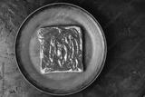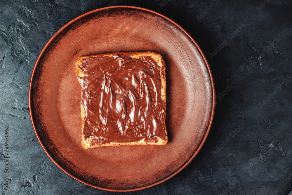 Toast with chocolate hazelnut cream in a brown plate on dark background, top view