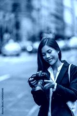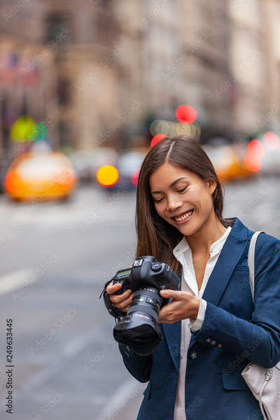 Asian woman photographer taking pictures with professional dslr camera on photography course in New York city street, NYC Usa travel.