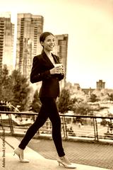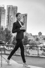 Asian business woman walking in city street fashion stylish suit outfit wearing kitten heels driking coffee cup outside of office building. Businesswoman lifestyle busy at work.