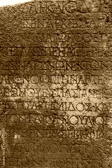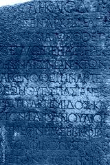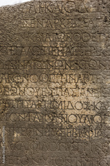 Historical site of Perge or Perga in Antalya, Turkey. Ancient text carved in wall. Vast remains of prosperous Roman city. Ancient Perge city existed from X century before Christ till VIII of our era.