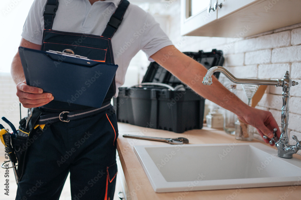 Cut view of handyman holding tool box and wrench in hands. He stand in kitchen at sink. He open water tap.