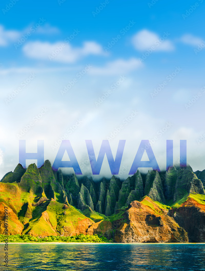 HAWAII travel background title written over blue sky famous hiking or cruise tourist destination Na Pali Coast mountains in Kauai island, Hawaii, USA. Background for tourism vacation luxury holidays.