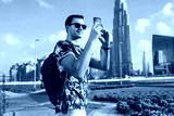 Young handsome man in t-shirt and sunglasses with backpack happily taking photos on cellphone of city with beautiful skyscraper on background outdoor