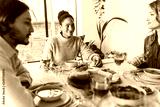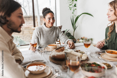 Pretty smiling african american woman with dark curly hair sitting at the table full of food dreamily looking aside. Group of young international friends spending time together on lunch in cozy cafe