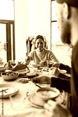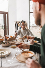 Cheerful african american woman with dark curly hair sitting at the table eating soup with slice of bread in hand joyfully looking aside. Group of young international friends having lunch in cozy cafe