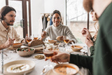 Smiling african american woman with dark curly hair sitting at the table eating soup with slice of bread in hand dreamily looking aside. Group of young international friends having lunch in cozy cafe