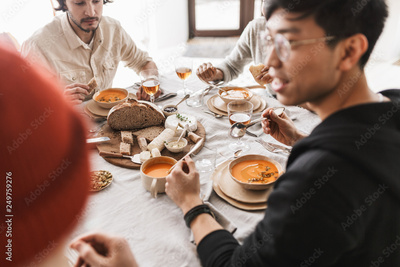Close up photo of tabale full of food. Group of international friends having lunch spending time together in cafe