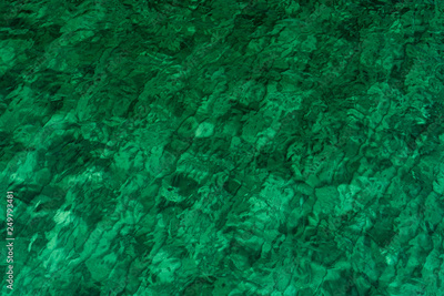 Green abstract texture background of emerald green sea water. Top view of green sea water with unique pattern. Green background. Sea water wave surface at coast. Turquoise water at shallow sea.