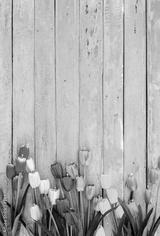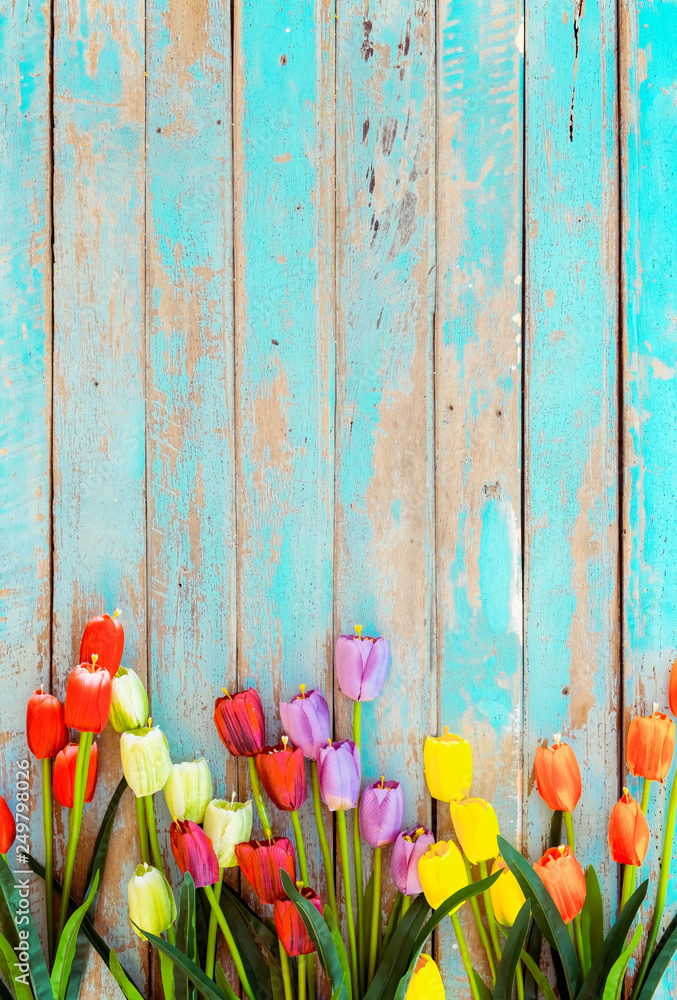Tulip blossom flowers on vintage wooden background, border frame design. vintage color tone - concept flower of spring or summer background