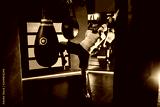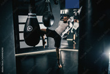 Muscular powerful Caucasian kick-boxer with boxing gloves on and in sportswear kicking bag in dark gym.