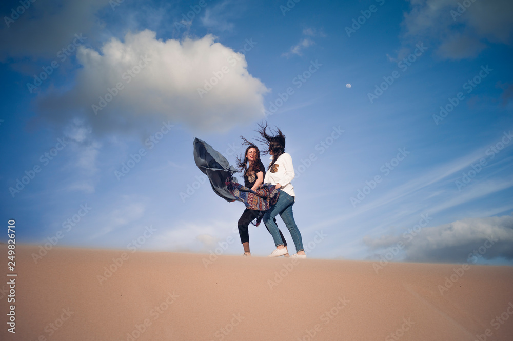 Two pretty women have fun in the dunes of Bologna, Andalucia Spain.
