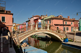 Woman tourist. Colorful concept. Venice, Burano island canal, small colored houses and the boats.