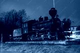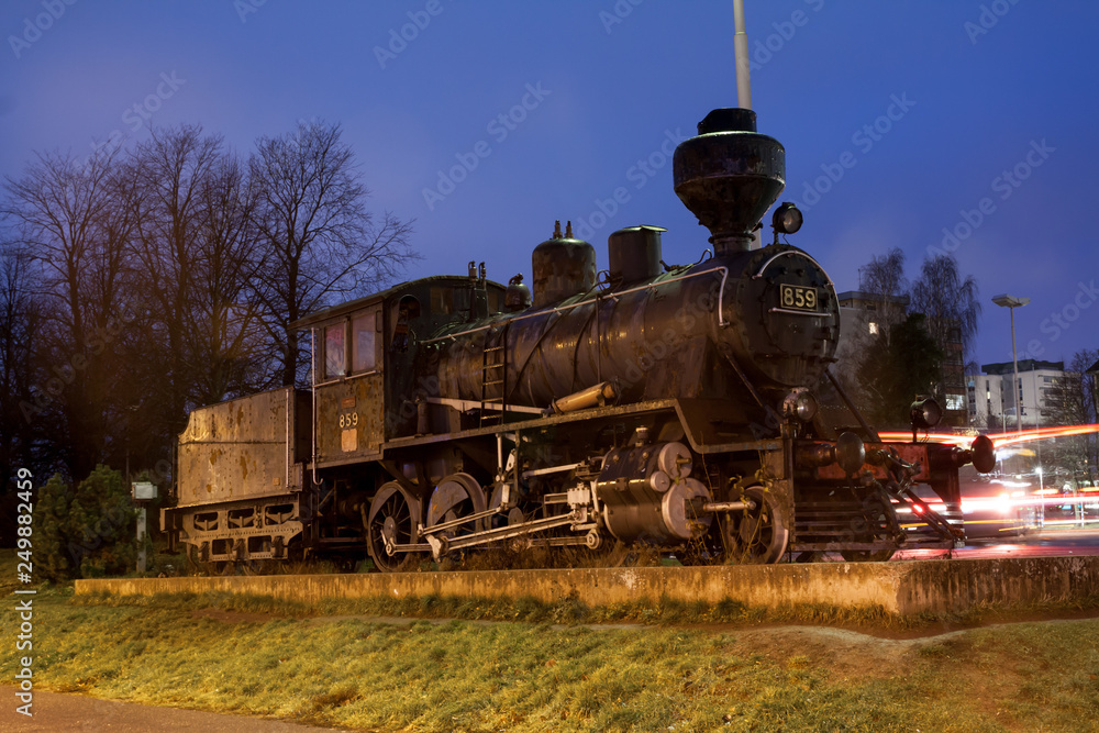 KOUVOLA, FINLAND - NOVEMBER 8, 2018: Old steam locomotive as an exhibit at the Kouvola railway station in Finland at night.
