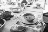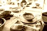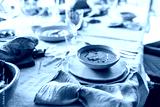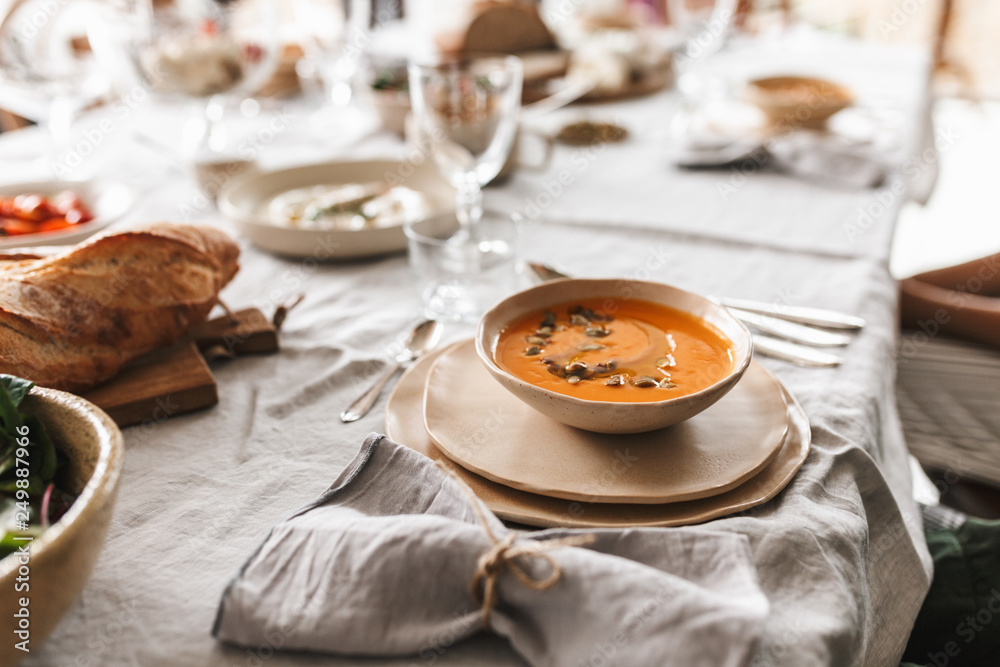 Close up bowl of cream pumpkin soup on table full of food on lunch in cozy cafe