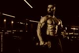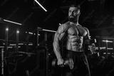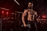 Muscular man working out in gym doing exercises with dumbbells, strong male naked torso abs