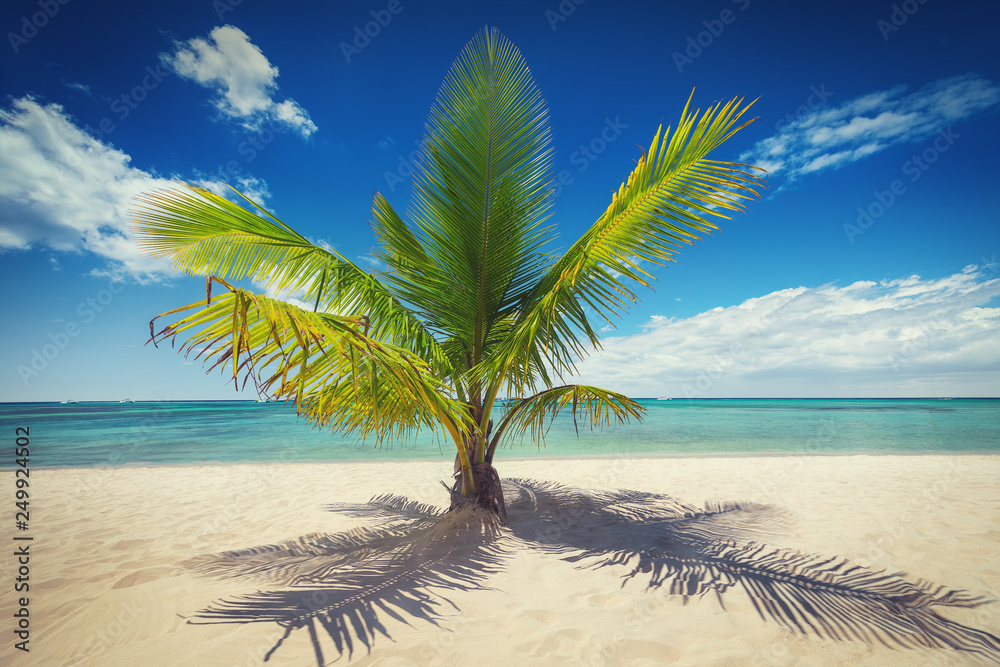 Palm trees on white sandy beach in Caribbean sea, Saona island. Dominican Republic.
