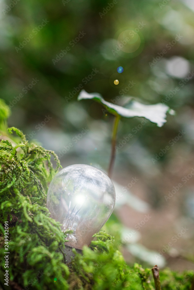 Discarded Car Light Bulb in Forest Woodland setting - Metaphor for renewable energy / fossil fuel / green ideas