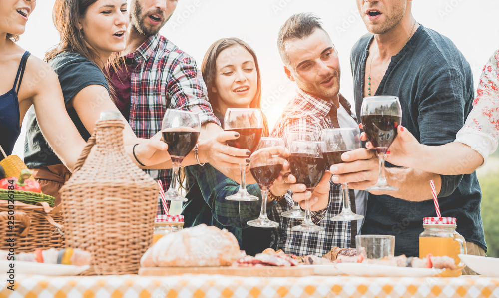 Happy friends cheering at barbecue picnic outdoor - Main focus on left guys faces