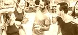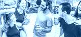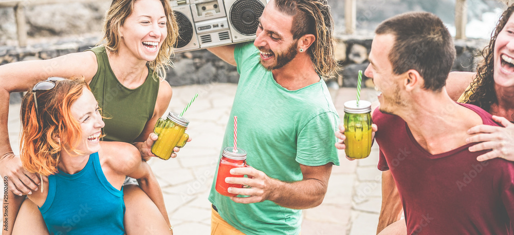 Happy friends drinking cocktails and listening music from old vintage stereo - Young trendy people having fun in summer at patio beach party - Youth lifestyle and fest concept - Focus on center man