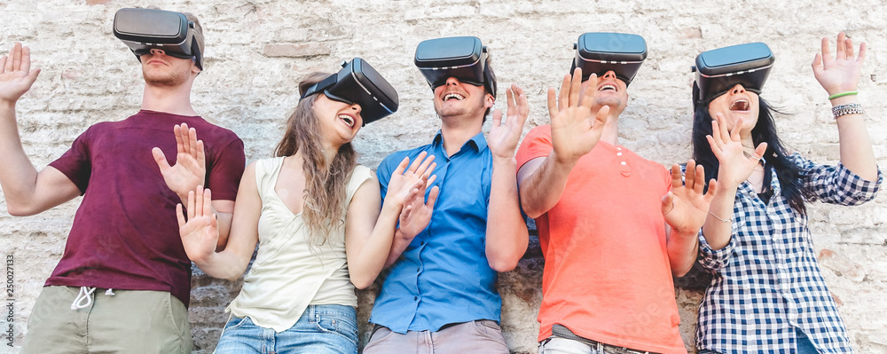 Young millennials friends wearing virtual reality glasses outdoor - Young people having fun with new technology vr goggles - Main focus on headsets - New z generation trends and tech concept