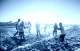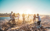 Happy friends having fun on the beach at sunset - Soft focus on right guys