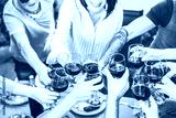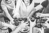 Different age of people cheering with red wine at barbecue dinner outdoor
