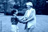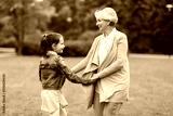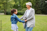 family, leisure and people concept - happy grandmother and granddaughter playing game or dancing at summer park