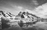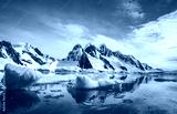 Blue Ice covered mountains in south polar ocean. Winter Antarctic landscape. The mount's reflection in the crystal clear water. The cloudy sky over the massive rock glacier. Travel wild nature