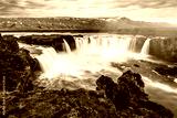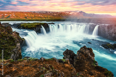 Colorful sunrise on Godafoss waterfall on Skjalfandafljot river, Iceland