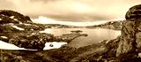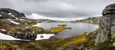 Typical norwegian landscape with snowy mountains and clear lake near the Trolltunga rock - most spectacular and famous scenic cliff in Norway