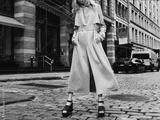 Fashionable woman wearing beige cotton long jacket and black high heels walking on city street of New York