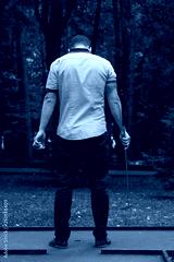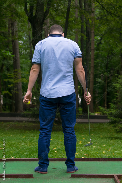 green mini Golf course, men in blue pants, rear view