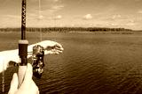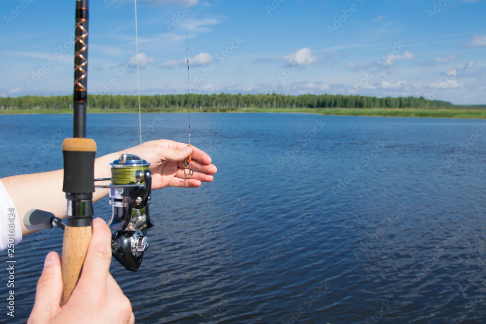 close - up of bait and spinning on the background of blue water, there is a place for the inscription