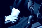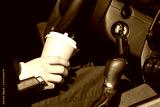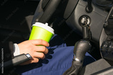close-up, the car driver's hand holding a glass of hot coffee, on a dark background