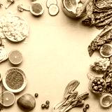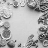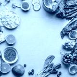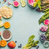 Healthy smoothie ingredients on light table, top view. Various fruits , vegetables and berries with almond, chia seeds and pine nuts for tasty vegan nutrition. Smoothie preparation with blender