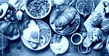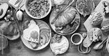 Breakfast food table. Festive brunch set, meal variety with fried egg, croissant sandwich, granola and smoothie. Overhead view