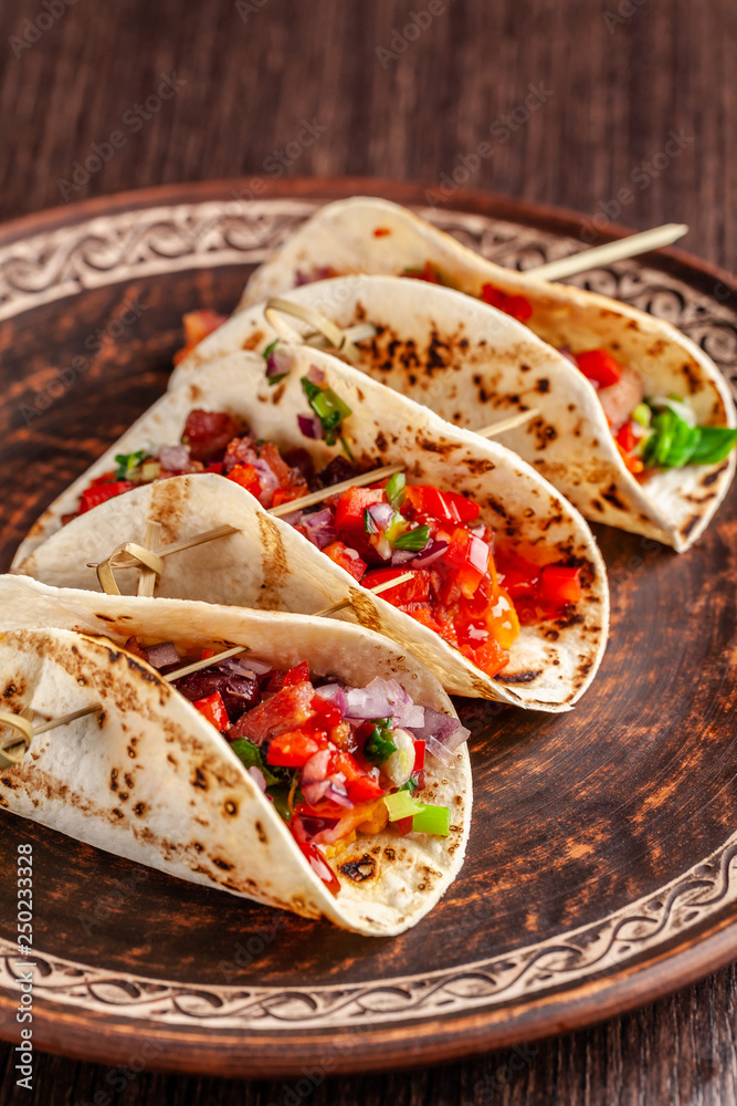 Concept of Mexican cuisine. Mexican appetizer Tacos with vegetables, beans, paprika, chilli peppers on fried unleavened bread cakes. Taco for veterinarians. Background image.
