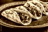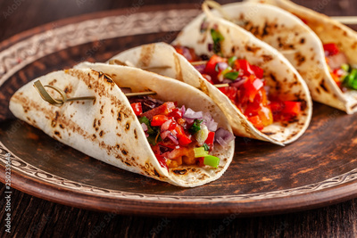 Concept of Mexican cuisine. Mexican appetizer Tacos with vegetables, beans, paprika, chilli peppers on fried unleavened bread cakes. Taco for veterinarians. Background image.