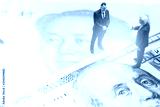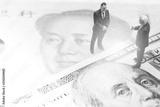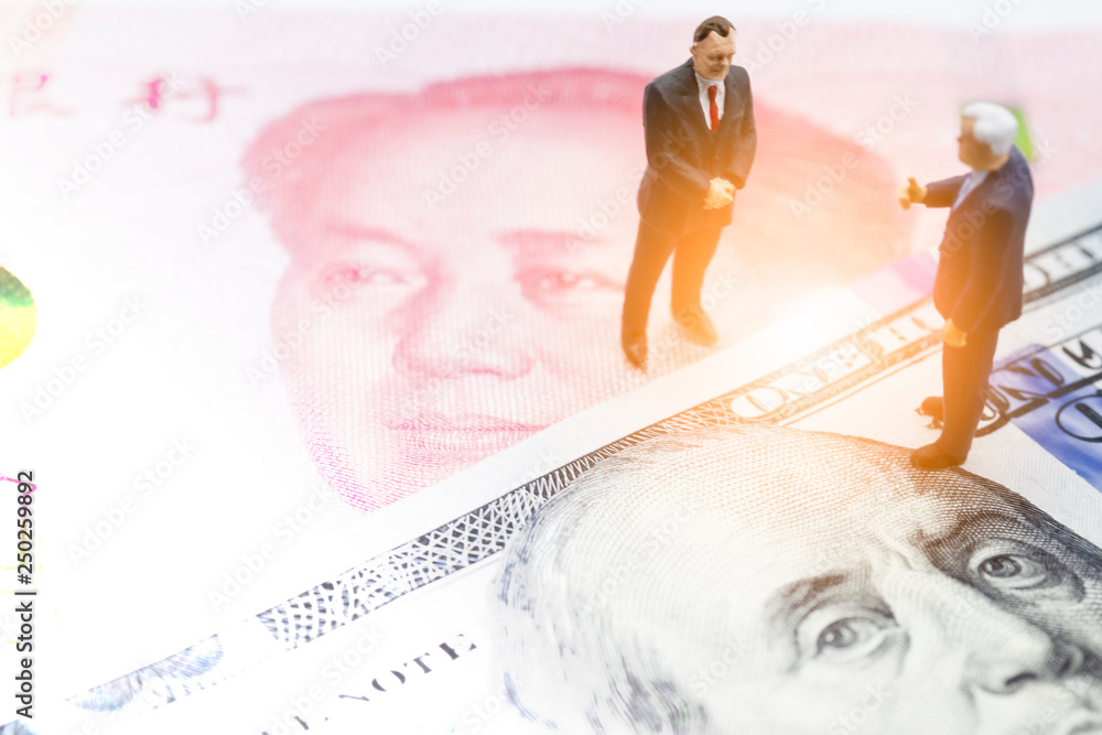 Miniature business men with US dollar and China Yuan banknote on cooperate meeting for trade war.Copy space and business concept. -Image.