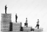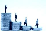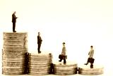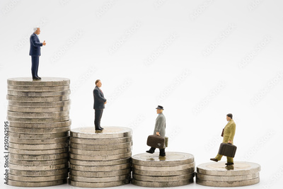 Miniature business man model on increase of stacking coins money with white background. Income growth when promote position level. Copy space and business concept. -Image.