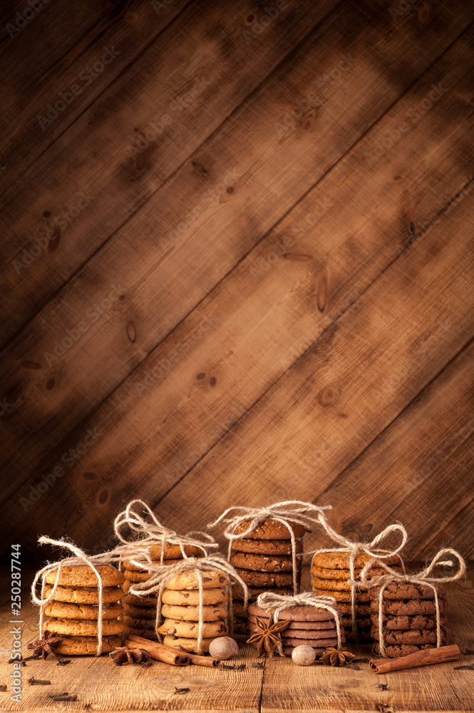 Various shortbread, oat cookies, chocolate chip biscuit and spice on dark rustic wooden table.