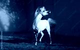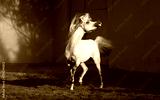 Funny light gray arabian stallion running and playing in the paddock. Horizontal, front view.