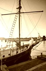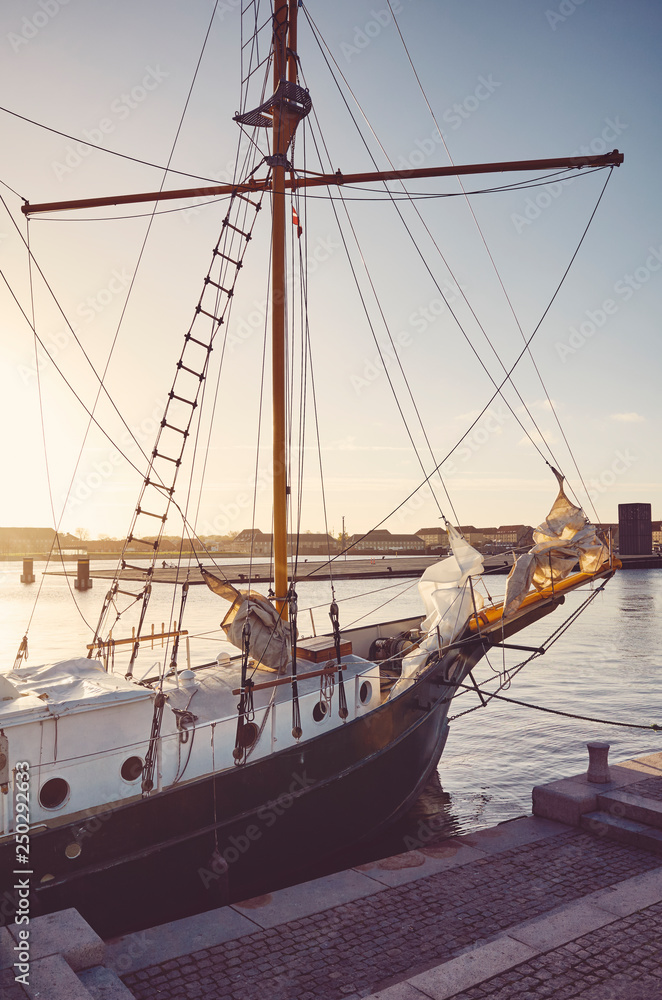 Old schooner moored to a pier in Copenhagen at sunset, color toning applied, Denmark.