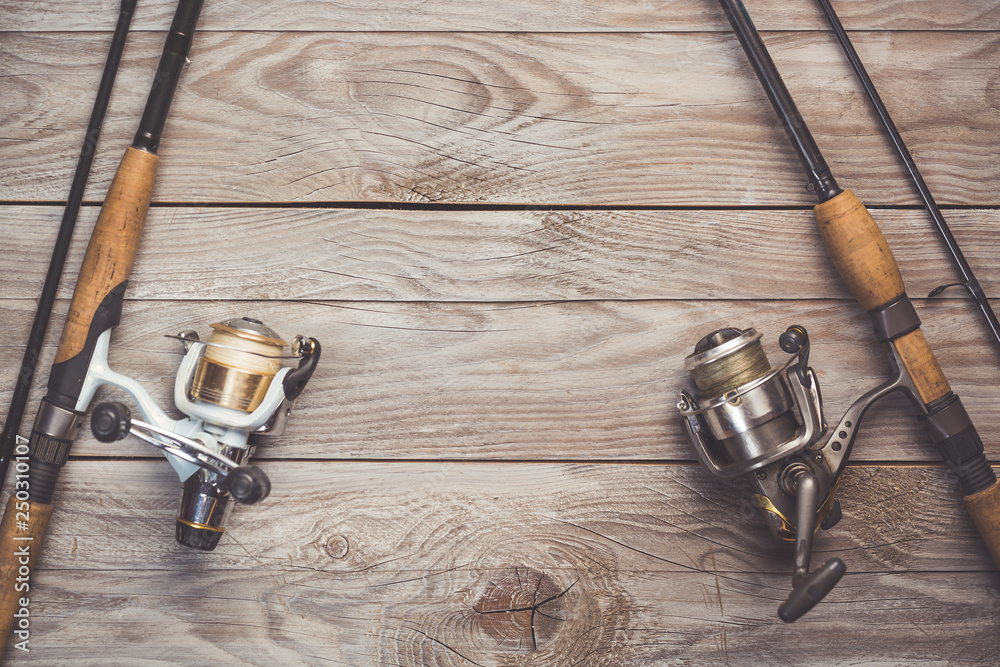 Fishing concept. Fishing spinning rods and reels with lines on wooden background with free space.