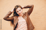 Outdoor portrait of young woman with long dark hair, wearing brown leather jacket