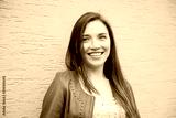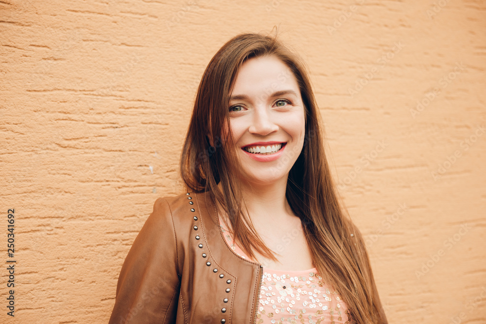 Outdoor portrait of young woman with long dark hair, wearing brown leather jacket