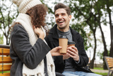 Portrait of happy people man and woman 20s drinking takeaway coffee from paper cups, while sitting on bench in green park