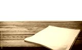 Empty tablecloth on wood table isolated on white background. Selective focus. Place for food. Top view. Mockup and template copy space.