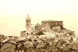 San Pietro Church (church Chiesa di San Pietro) view from the sea. The church of Portovenere with its walls on top of a cliff near the sea. St. Peter's Church in Portovenere, La Spezia, Gulf of Poets