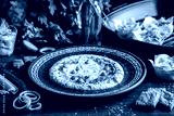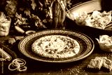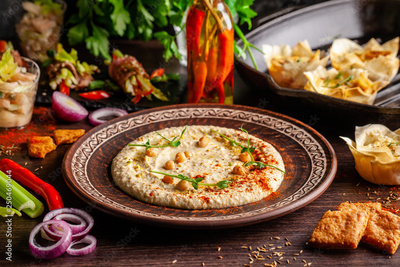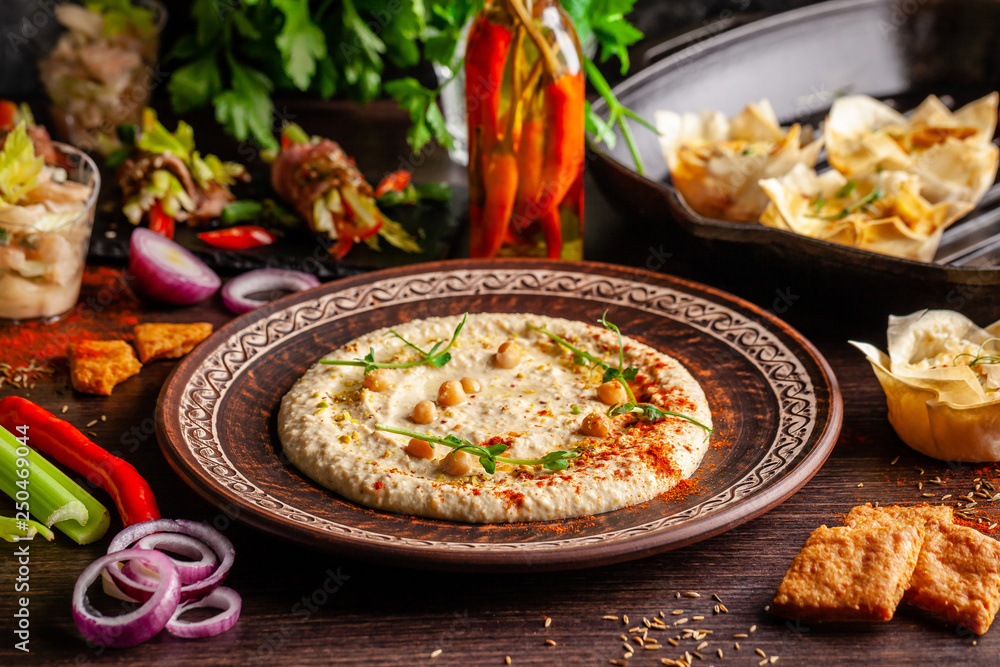 The concept of Arabic cuisine. Oriental hummus with grilled sesame and pistachios. Laid arabic table for the holiday. Background image. Top view, copy space